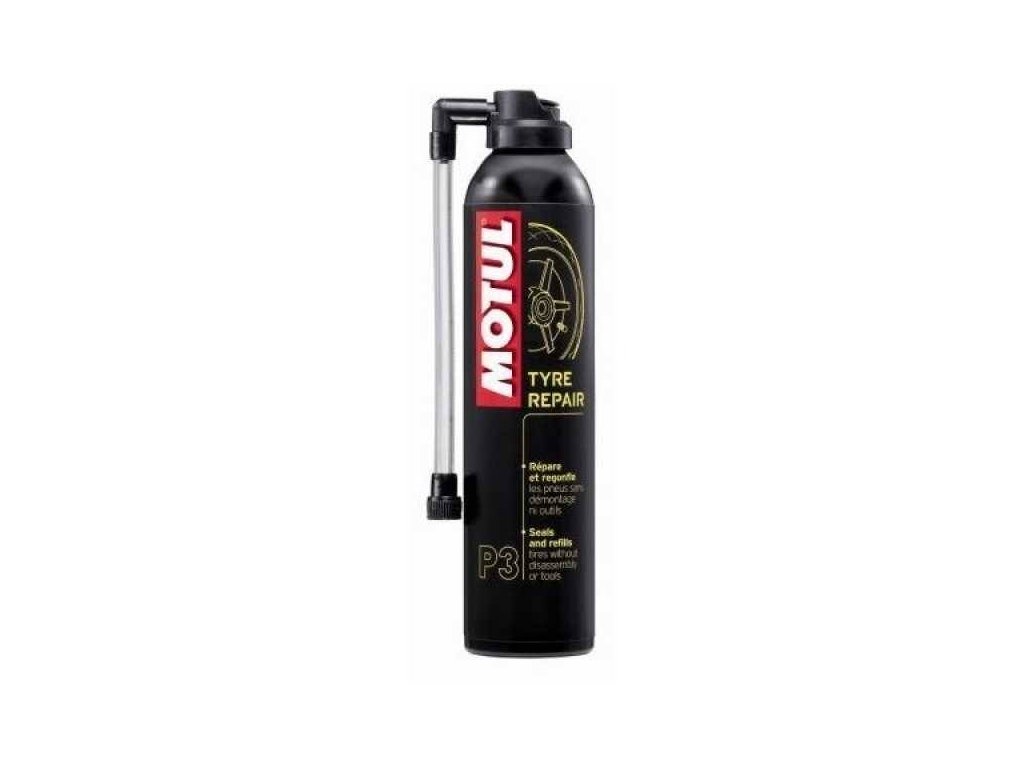 Každá část motocyklu vyžaduje speciální péči. Řada Motul® MC Care™, která byla uvedena na trh v roce 2011, byla vyvinuta pro poskytování kompletní údržby a péče o motocykl, motocyklistu i výbavu. Kategorie produktu: Motul® MC CARE™ P3 Tyre Repair je prostředek, který slouží k údržbě mechanických částí, konkrétně k okamžitým opravám a dohuštění pneumatik, aniž by bylo nutné je demontovat či používat nástroje. Jeho latexové složení nezpůsobuje poškození vnitřního pláště ani pneumatik.