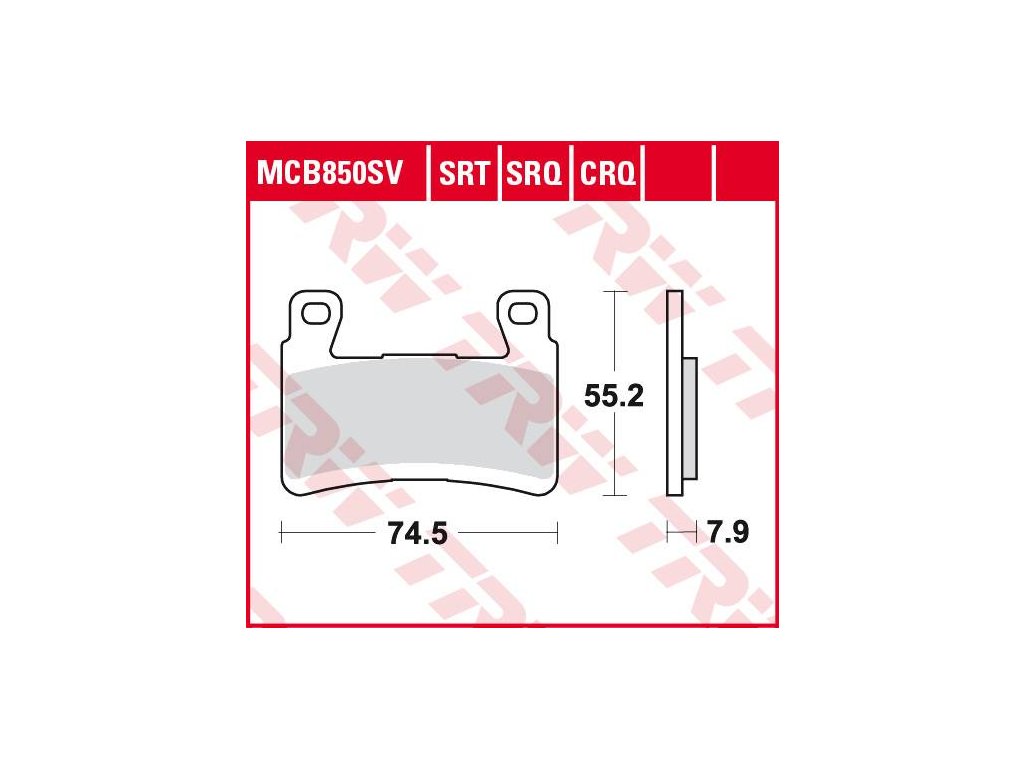 TRW SRT Sinter Road Racing TRW-MCB850SRT Destičky vhodné především pro přední brzdu, plnokovové destičky s antikorozním lakováním, velmi dobrý třecí koeficient s výborným efektem, střední potřeba manuální brzdné síly na páčce, použití na všechny druhy kotoučů ale pouze pro přední brzu, Destičky MAJÍ homologaci pro pozemní komunikace, vhodné tedy pro sportovní jezdce na silnici. Výborného brzdného učinku dosahují jak při nízkých tak při vysokých teplotách stejně jako při dešti. Tyto destičky jsou jasná volba pokud jezdíte na okruhu, i na silnici.
